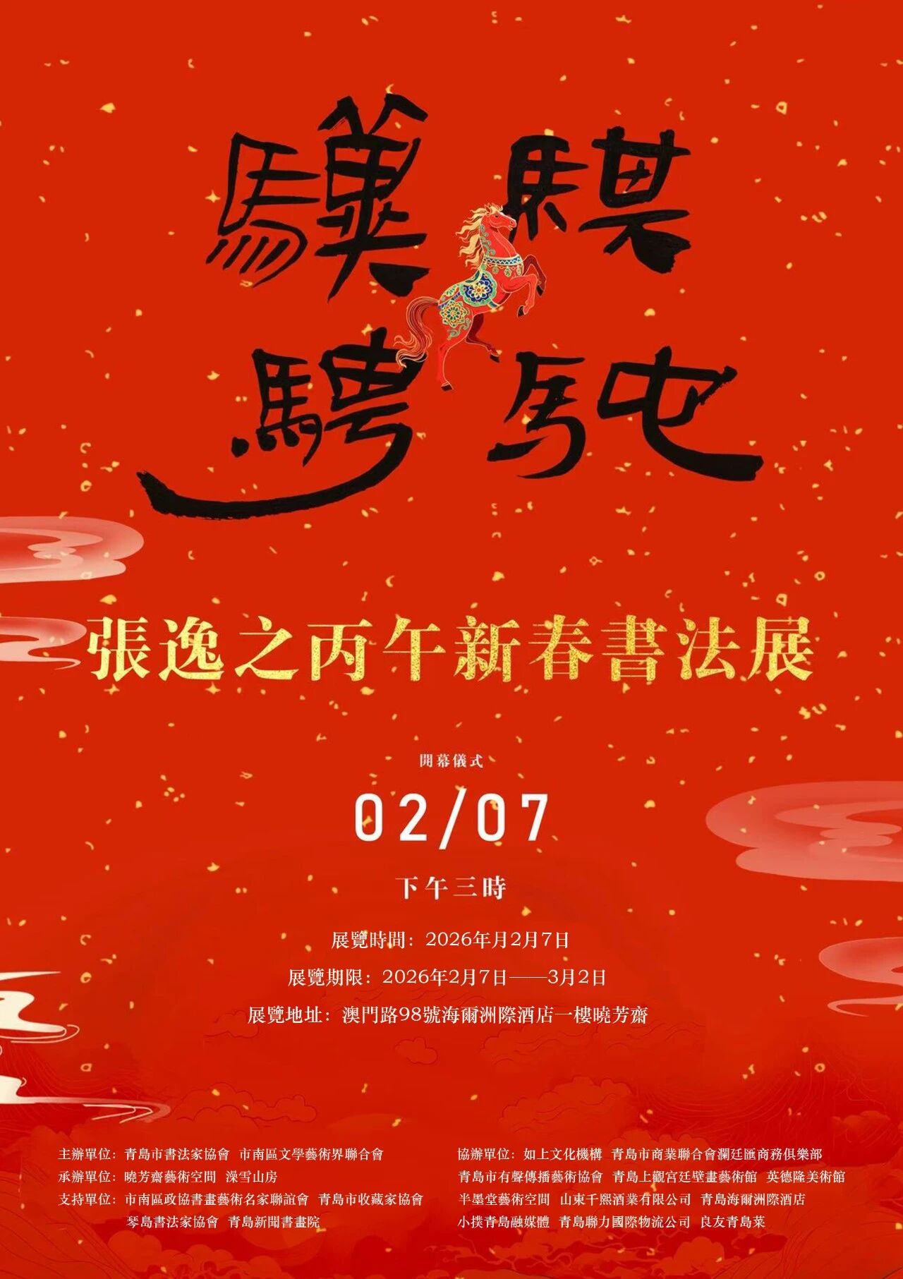 2月7日下午3时,“骐骥驰骋”张逸之丙午新春书法展将在青岛晓芳斋开幕。本次展览由青岛市书法家协会、市南区文学艺术界联合会主办,晓芳斋艺术空间、澡雪山房承办。展览将持续至3月2日,欢迎市民游客免费参观。